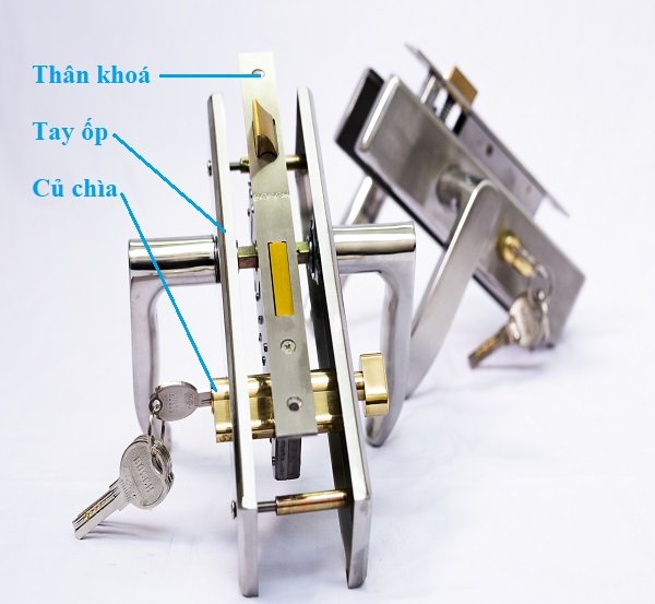 -Tay khoá (tay ốp, tay gạt) có 2 loại phổ biến là dài 20cm dùng cho cửa phòng, cửa ký thuật và 26 cm dùng cho cửa chính, cửa đại.